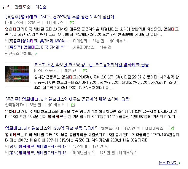 영화테크는 자동차 부품생산 전문기업이네요. GM과 1천 289억원 규모의 부품공급계약으로 인해 상한가에 도달했는데요, 요즘같이 전 세계적으로 소비가 침체된 시기에 정말 박수를 쳐 줄 만한 기업입니다! 훌륭합니다.