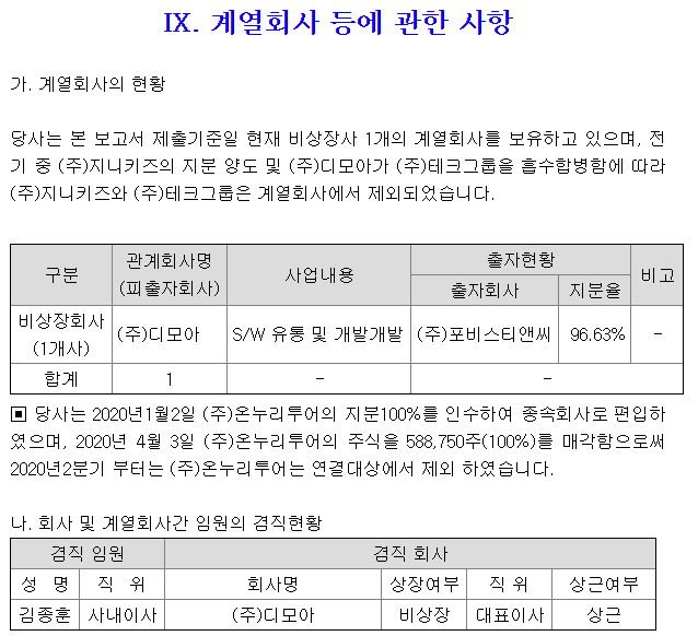 포비스티앤씨가 96.63%로 출자한 디모아는 비상장회사로, 소프트웨어 유통사업을 하고 있네요. 포비스티앤씨에서 하는 일을 넘기는 것이라 확실히 포비스티앤씨에 대한 경영 적합성 판단은 필요할 것 같습니다. 다만 출자회사에서 그 일을 받아 간 것, 그리고 포비스티앤씨에게 해당 사업은 약 15%의 영향력이 있었던 것으로 보면 조금 안심이 됩니다.