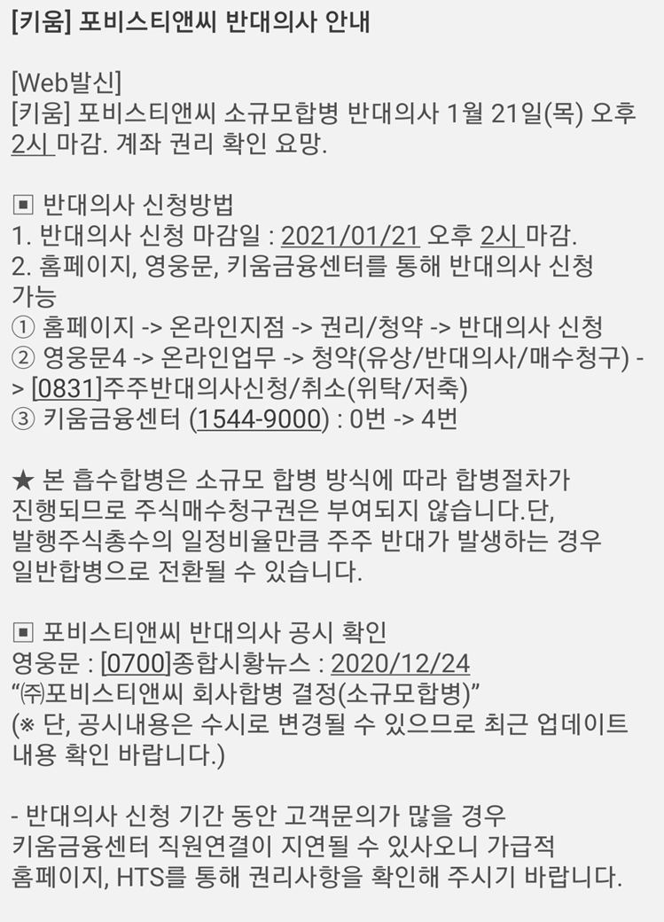 오늘 오후, 문자 한통이 들어옵니다. 키움증권에서 포비스티앤씨 소규모합병에 대한 반대의사를 신청하라는데, 이거 주식시장에 너무 관심이 없었네요.