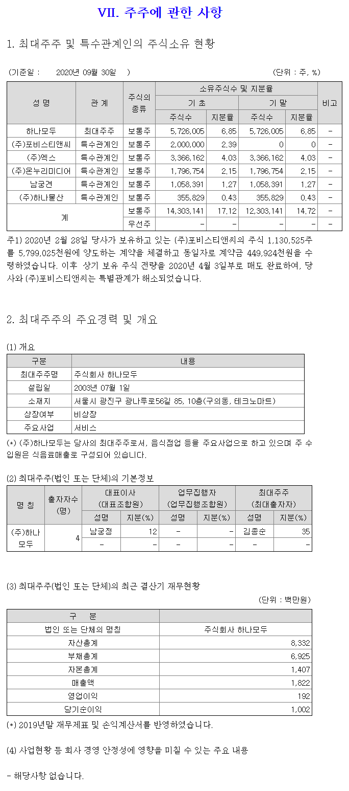 엔케이물산의 공시자료에 나와있는 주주관계를 봅니다. 자료는 2020년 3분기 결산보고입니다.